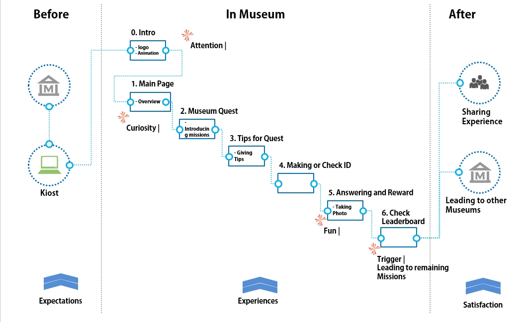 This system was established based on the seven gamification components set by Zichermann from the design stage. Based on the premise that the players have visiting experiences at museums, the system excluded the process of ‘onboarding’ designed for newcomers and applied the rest of the components only.